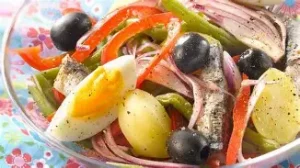 Les divers ingrédients utilisés pour réussir la recette sont : sardines vidées et écaillées, huile d’olive, jus de citron, brins de thym, gousse d’ail pelée, tomates cœur de bœuf, branche de céleri, cébettes, radis, poivron, feuilles de laitue, bouquet de basilic, fèves, œufs, gousse d’ail, filets d’anchois à l’huile d’olive, olives niçoises…