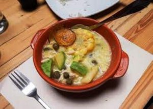 L’ajiaco est une soupe colombienne à base de pommes de terre. Si la recette varie selon les régions, l’ajiaco le plus connu vient de Bogotá. Elle contient des morceaux de poulet, des gros épis de maïs, plusieurs variétés de patates pour épaissir la soupe (il y a notamment des patates douces !) et de l’herbe aromatique guasca. Des câpres, de l’avocat et de la crème épaisse sont également ajoutées.