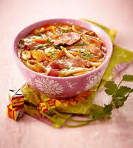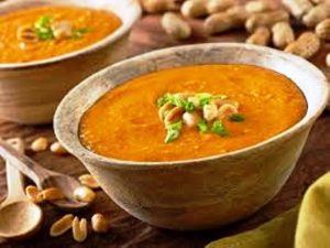 Une soupe de cacahuètes, agrémentée de viande, de pâtes et de légumes de saison.