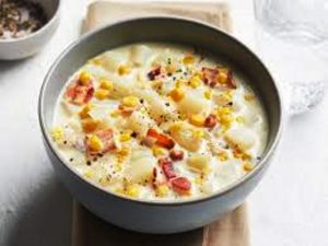 Elle se compose comme son nom l’indique de maïs, mais aussi de bouillon de poulet (peut-être remplacé par du bouillon de légumes), de pommes de terre, d’oignons, d’épices et saupoudré en général de bacon grillé en dés.