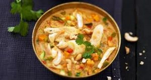 Les divers ingrédients utilisés pour réussir la recette sont : oignons, poivron rouge, poivron vert, petites courgettes, poireaux moyens, carottes, escalopes de poulet, lait de coco, pâte de curry « mild », huile d’olive, lentilles corail, bouquet de coriandre, noix de cajou salées, sel…