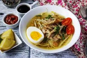 C’est une soupe de poulet avec du vermicelle, des œufs durs, des chips de pommes de terre, des feuilles de céleri et des échalotes. Elle est jaune car on y ajoute du curcuma.