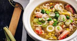 Les divers ingrédients utilisés pour réussir la recette sont : bouillon de volaille, brins de citronnelle, feuilles de kaffir/lime, citrons verts, piments frais, morceau de galanga, tomates, pousses de jeune maïs, champignons de paille, crevettes crues, sauce Nuoc Mam, pâte de piment, gousse d’ail grillé, coriandre en poudre, sel, poivre…