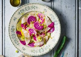 Les ingrédients nécessaires pour réaliser la recette sont : noix de ris de veau, filet d’anguille fumée, pommes de terre, raifort, beurre, lait, caprons, vinaigre balsamique, fond de veau, bouquet garni, sel, poivre, muscade…