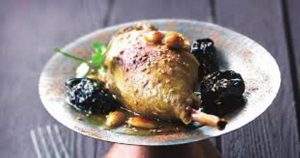 Les ingrédients nécessaires pour réaliser la recette sont : cuisses de canard frais, pruneaux, amandes mondées, graines de sésame, oignons, gousses d’ail, curcuma, gingembre en poudre, cannelle en poudre, sucre, huile d’olive, huile pour friture, sel, poivre…