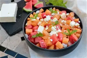 Salade roquette melon pastèque feta et menthe