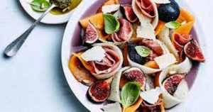 Les divers ingrédients utilisés pour réussir la recette sont : grandes tranches fines de jambon de pays, petit melon, figues sèches moelleuses, mascarpone, gressins, porto, poivre…