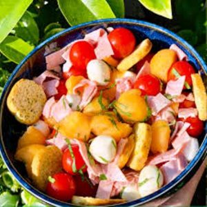 Les divers ingrédients utilisés pour réussir la recette sont : coquillettes, petits melons, jambon cru, bouquet de basilic, vinaigre, huile d’olive, sel, poivre…