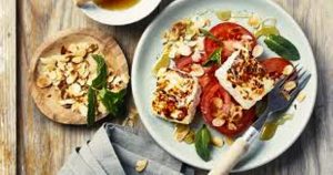 Les divers ingrédients utilisés pour réussir la recette sont : feta en bloc, amandes effilées, brins de menthe, tomates, farine, huile d’olive, miel liquide, sel, poivre…