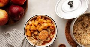 Les divers ingrédients utilisés pour réussir la recette sont : flocons d’avoine, lait d’amande, pommes (type Gala ou Fuji), sirop d’érable, cannelle, beurre de cacahuètes…