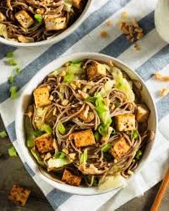 Pour les nouilles : nouilles soba, choux pak choï effeuillés, bloc de tofu extra-ferme, tiges de cébette, huile de sésame pour la cuisson, cacahuètes hachées…