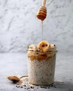Les divers ingrédients utilisés pour réussir la recette sont : graines de chia, lait d’avoine, cardamome en poudre, clous de girofle, cannelle en poudre, gingembre en poudre, noix de muscade en poudre, miel, beurre de cacahuètes, banane, copeaux de chocolat noir…