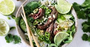 Les divers ingrédients utilisés pour réussir la recette sont : bœuf (filet ou rumsteck), vermicelles de riz, concombre, feuilles de menthe, feuilles de coriandre, cacahuètes…
