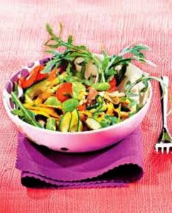 Les divers ingrédients utilisés pour réussir la recette sont : mélange de légumes grillés décongelés (type Picard), roquette, fèves fraîches pas trop grosses, cacahuètes salées, vinaigre balsamique, huile d’olive, sel, poivre…