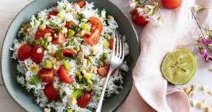 Les divers ingrédients utilisés pour réussir la recette sont : tomates cerise, botte de cébettes, crème de noix de coco non sucrée, cacahuètes grillées et salées, riz basmati, brins de persil, brins de ciboulette, citron vert, huile d’olive, sel, poivre…