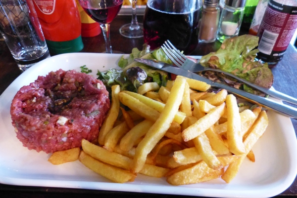 Notre choix s’est fait sur la formule du midi à 15.90 €: soit : entrée, plat, dessert, mon convive a opté pour une part de quiche lorraine, pour moi un œuf cocotte avec des mouillettes bien toastées, un peu plus de cuisson pour l’œuf aurait rehaussé le goût, pour suivre nous avons dégusté un bon et copieux tartare de bœuf au bleu et aux noix, bonne préparation, accompagné de frites croustillantes et d’une verdure bien assaisonnée.