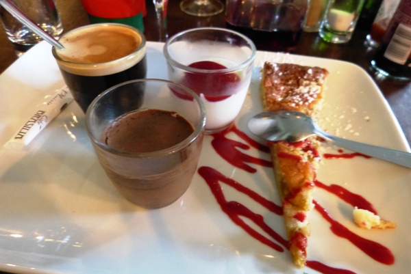 Pour le dessert, ce fut un café gourmand, une mousse au chocolat tenait compagnie à une pana cotta qui côtoyait une petite parte de tarte aux mirabelles, pâte sablée.