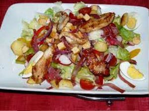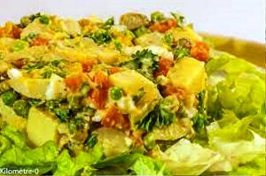 Les ingrédients utilisés pour réussir cette recette sont : La salade : filet de poulet, carotte, pomme, olives vertes, petit pois, maïs, persil…La sauce : fromage blanc, huile d’olive, sel, poivre, jus d’un citron vert, moutarde…Les frites : pomme de terre, huile d’olive, vinaigre…