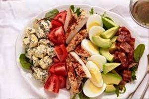 Les ingrédients utilisés pour réussir cette recette sont : poitrines de poulet coupées en deux à l’horizontale, tranches de bacon, sel, poivre du moulin, paprika, oeufs, vinaigre de vin rouge, huile de canola, ciboulette fraîche hachée, mesclun, avocats coupés en quartiers, tomates coupées en quartiers, fromage Bleu canadien coupé en cubes…