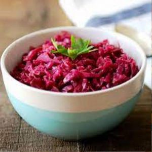 Les ingrédients utilisés pour réussir cette recette sont : chou rouge, pommes, huile d’olive, jus de pomme, vinaigre de cidre, sucre de bouleau, sel, poivre…