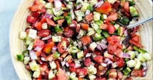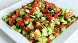 Les ingrédients utilisés pour réussir cette recette sont : concombre, tomates, oignon rouge, piments longs verts, jus d’un citron vert, huile d’olive, menthe séchée, sumac, sel & poivre…