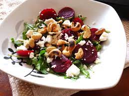 Les ingrédients utilisés pour réussir cette recette sont : roquette, feta, noix de cajou, betteraves, crevettes roses décortiquées, cœurs de saumon fumé coupés en dés, kiwi pelé et coupé en rondelles, pamplemousse rose pelé, endive, baies roses, brins de ciboulette ciselée, vinaigre de xérès, huile de tournesol, sel, poivre…
