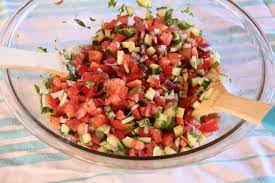 Les ingrédients utilisés pour réussir cette recette sont : tomates Roma (fermes), coupées en petits dés, mini concombres , coupés en petits dés, persil frais finement ciselé, poivron vert corne de bœuf , coupé en petit dés, petit oignon rouge , pelé et coupé en petits dés, citron fraîchement pressé, vinaigre blanc, fleur de sel, cumin moulu, piment rouge, huile d’olive…