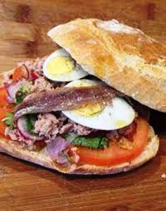 Le pan bagnat est une spécialité culinaire traditionnelle de la cuisine niçoise. C’est un sandwich à base de pain long ou rond, et d’ingrédients similaires à la salade niçoise (anchois, crudités, olives noires et huile d’olive).