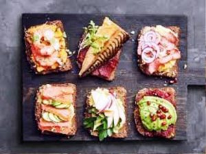 Les ingrédients utilisés pour réaliser le smorrebrod sont : pain noir danois, œufs, ciboulette hachée, brins d’aneth, mini concombre, radis roses, cornichons, crème fraîche ou de mayonnaise, beurre, fruits de mer surgelés, noix de Saint Jacques, tranches de saumon fumé, petit pot de fromage frais nature ou aux herbes, feuilles de salade iceberg, tarama, œufs de saumon, huile d’olive, sel et poivre….