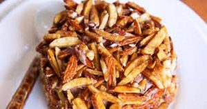 Pour l’enrobage d’amandes caramélisées : beurre doux fondu, sucre brun, miel, éclats d’amandes effilées, légèrement grillées…