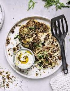 Les divers ingrédients utilisés pour réussir la recette sont : chou-fleur, gousses d’ail, cumin en poudre, jus et zeste de citron bio, tahiné, graines de sésame, huile de sésame, huile d’olive…