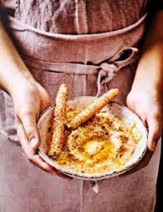 Pour l’houmous : patate douce, gousse d’ail, pois chiches égouttés, tahini, huile d’olive, cumin en poudre, piment, citron…