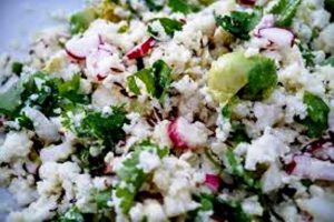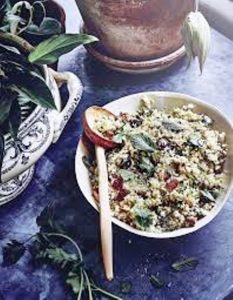 Les divers ingrédients utilisés pour réussir la recette sont : fleurettes de chou-fleur (blanc, vert, jaune, violet), raisins secs, cranberries séchées, amandes torréfiées, branches de menthe, branches de coriandre, jus de citrons verts bio, huile de sésame toastée…