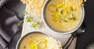 Les divers ingrédients utilisés pour réussir la recette sont : poireaux, crème fraîche , bouillon de volaille, petits lardons, cheddar, poivre du moulin, beurre…