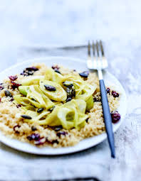 Les divers ingrédients utilisés pour réussir la recette sont : gros poireaux, semoule de blé, lait de coco, curry, cranberries séchées, graines de courge, huile d’olive…
