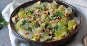 Les divers ingrédients utilisés pour réussir la recette sont : gros poireaux, champignons de paris, belles échalotes hachées, bouquet de persil ciselé, fromage de chèvre frais, noisettes décortiquées et torréfiées, gousses d’ail, épinards frais, crème liquide, huile d’olive, sel, poivre…