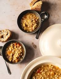 Les divers ingrédients utilisés pour réussir la recette sont : pois cassés secs, oignon, branches de romarin, gousses d’ail, poireau, chou kale, carottes, branches de céleri, rutabaga, panais, lentilles corail, orge perlé, bouillon de légumes, huile…