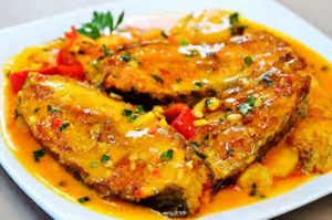 Les divers ingrédients utilisés pour réussir la recette sont : lotte, citrons verts, sel, huile, oignon émincé, gousses d’ail, tomates, poivron rouge, poivron vert, lait de coco, bouquet de coriandre, huile de palme rouge »dendé », sel, poivre…