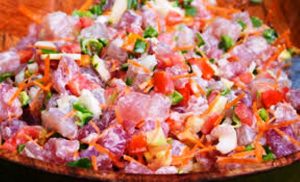 Vous ne connaissez pas encore le i’a ota, poisson cru à la tahitienne ? Il est grand temps. Ce plat polynésien « Ei’a ot’a », ressemble un peu au ceviche, il se compose de poisson frais (thon, dorade) coupés en dés assaisonnés de sel et citron. Cette marinade permet de faire cuire le poisson avec le contact avec l’acidité. La petite touche gourmande en plus ? On le sert avec du lait de coco qu’on ajoute à la fin !