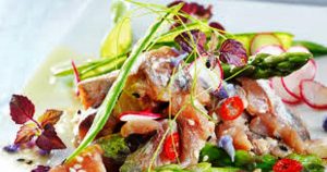 Les divers ingrédients utilisés pour réussir la recette sont : asperges vertes, rougets grondin, scampis, œufs, crème entière (33% de matières grasses), filet de porc, tranches de pancetta, œufs, botte de persil frisé, échalotes, moutarde, vinaigre, huile d’arachide, câpres, cornichons, estragon, persil, shizo, huile d’olive, noix de muscade…