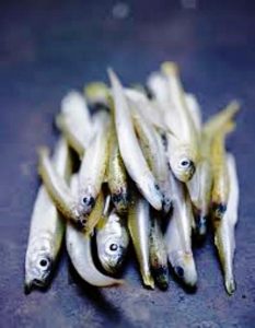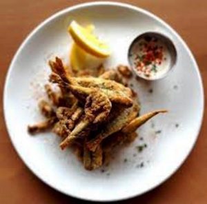 Pour les éperlans : éperlans frais de taille moyenne, vidés et nettoyés, et l’arête centrale retirée avec la queue, farine, semoule de blé dur fine, huile végétale pour la friture…