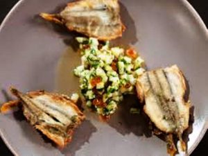 Éperlans frits à la chermoula et sauce vierge au concombre