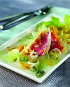 Les divers ingrédients utilisés pour réussir la recette sont : rougets barbets entiers écaillés, carottes, poivron, branche de céleri, oignon grelot, feuilles de basilic, brins de thym, feuilles de laurier, olives noires dénoyautées, huile d’olive, vinaigre de Xérès, herbes fraîches…