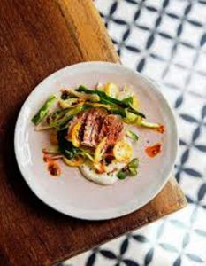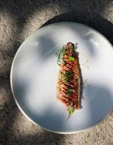 Pour la sauce vierge : concombre anglais, coupé en brunoise, œufs de saumon, aneth frais, petite échalote française, ciselée, huile d’olive, citron, le zeste seulement, sel, poivre…