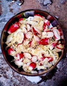 Les divers ingrédients utilisés pour réussir la recette sont : radis tranchés en fines rondelles, champignons de Paris émincés, asperges blanches ou vertes émincées, choux fleur violet, piment rouge très finement tranché en fines rondelles, sans les graines, gingembre confit haché, sauce soja, piment d’Espelette, graines de sésame, feuilles de shiso rouge, jus de yuzu…
