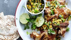 Pilons et ailes de poulet marinés salade de maïs grillé
