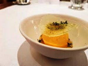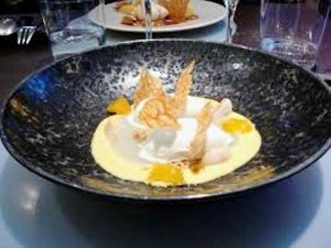 Comment oublier le crémeux fromage blanc et clémentine givrée sous une mousse de clémentine, accompagnée d’une gelée de vin blanc préparée comme un vin chaud.