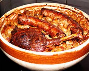 Ingrédients clés : Haricots lingots, de diverses pièces de porc et volaille (confit, échine, poitrine, couennes, jarrets de porc), agrémentés d’oignons, bouquet garni, et assaisonnements….