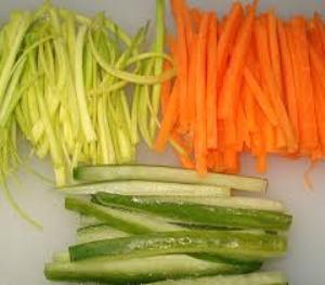 Pour tailler une julienne, il faut d’abord tailler les légumes en tranches très fines (2 mm d’épaisseur), les superposer et ensuite les émincer en filaments réguliers.