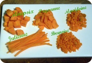 En cuisine on peut découper des légumes suivant différents gabarits utilisés en fonction des caractéristiques du plat : en julienne, en macédoine, en brunoise, en salpicon, à la paysanne ou à la parisienne…., je vous propose de décrire plusieurs mode de taillage des légumes, à découvrir :